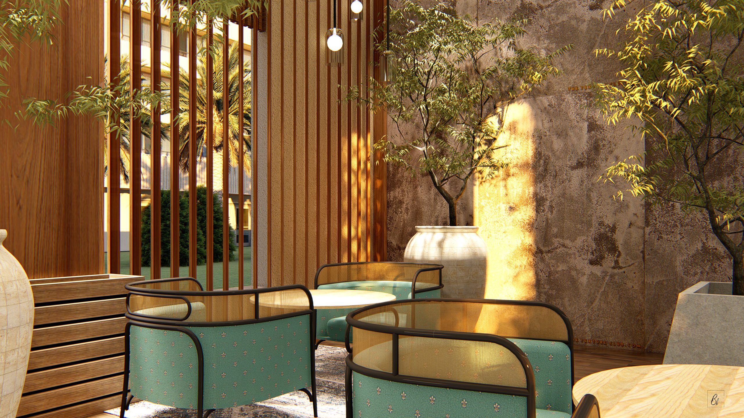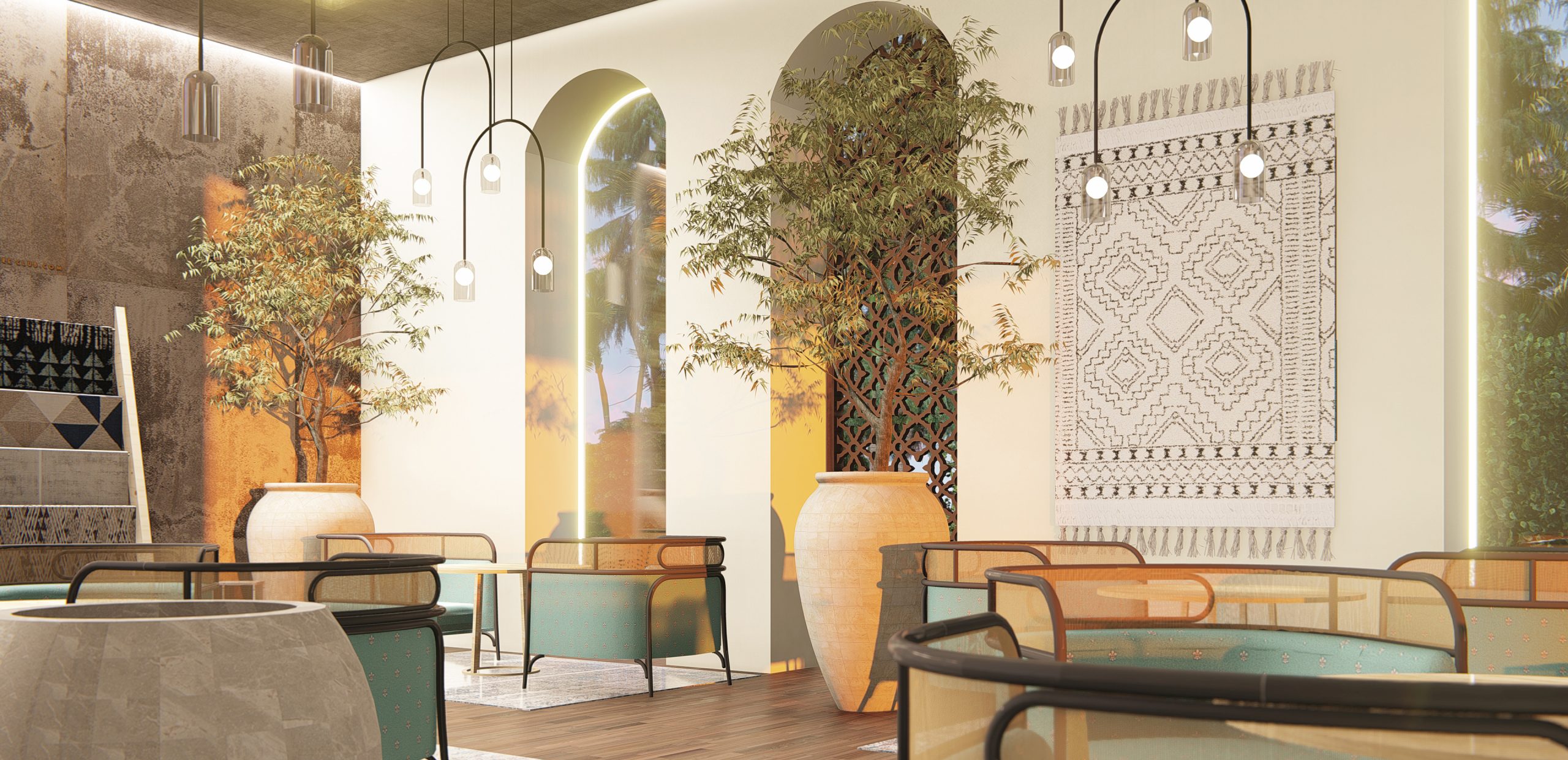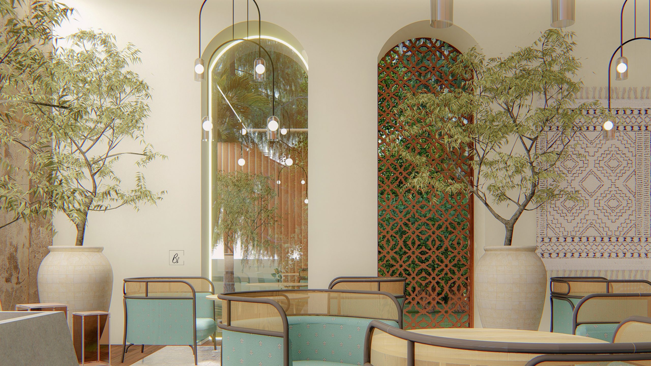 The design is the combination of wabi – sabi and Persian architecture . More than a decorative style, Wabi- Sabi is a philosophy of life, with the aim of peacefully accepting the natural cycle of growth and decay inherent in life. The design is about imperfect , impermanent and incomplete.